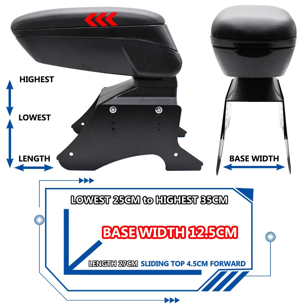 5. Base width 12.5cm, top armrest size – 27cm x 11cm, sliding top 4.5cm forward